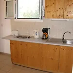 Willa Nikos oferuje jadalnię na świeżym powietrzu z urządzeniem do parzenia kawy/herbaty. W kuchni znajdują się czajnik elektryczny, lodówka i przybory kuchenne.